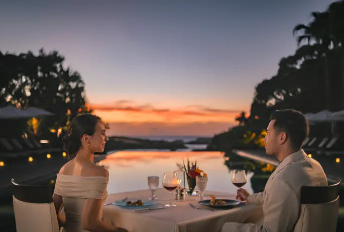Mark your anniversary or other special occasion with a touch of elegance. A candlelit dinner at poolside, flowers from our garden, and the glow of sundown set the scene, while a complimentary glass of champagne heightens the mood.