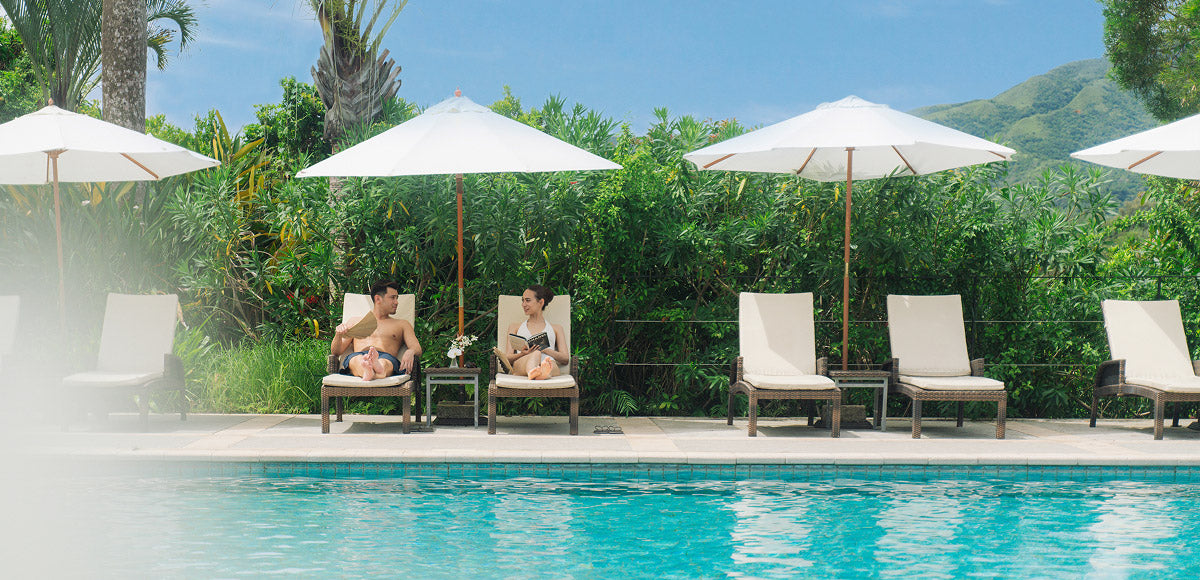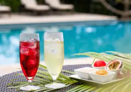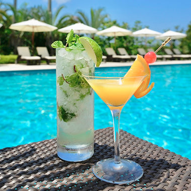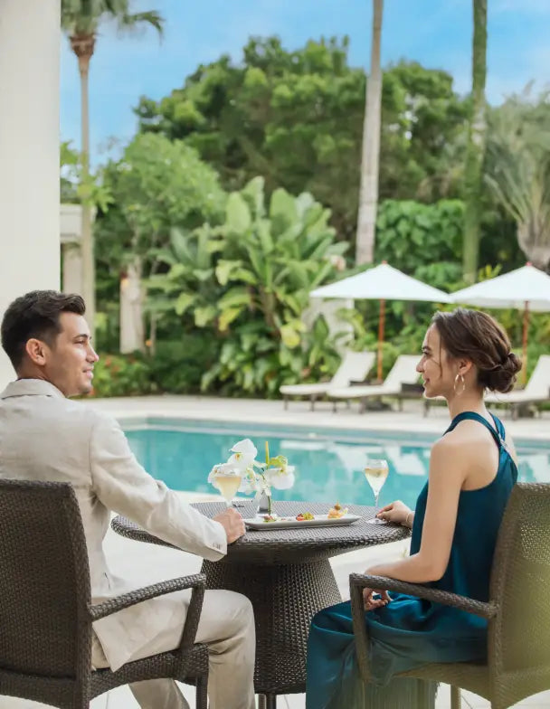 プールサイドに広がる開放的なラウンジでは、季節のカクテルやスイーツ、ティータイムやアペリティフタイムなど大人の優雅なくつろぎと華やぎを演出します。