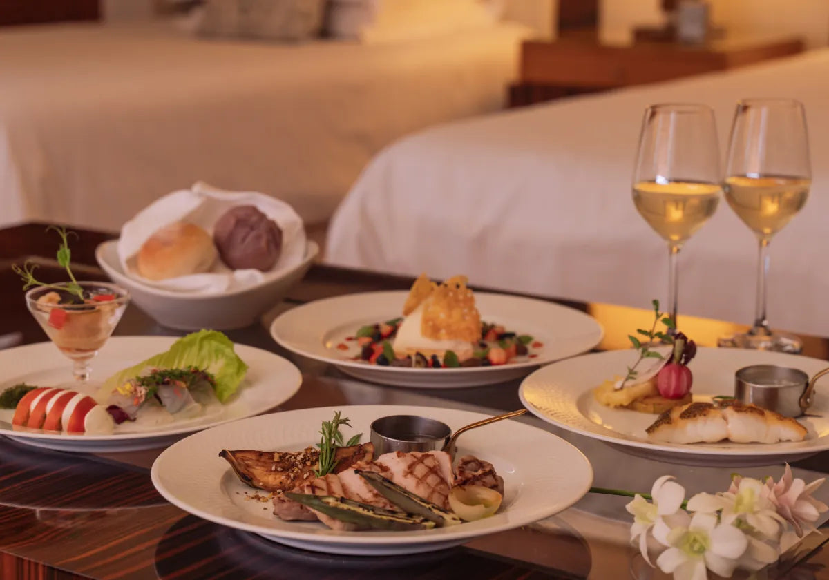 ワインと美食に彩られたプライベートディナー。「美ら島あぐーのグリル」をメインに、ファインダイニングでこれまでご好評いただいたアラカルトメニューを贅沢なコース仕立てでご提供いたします。お部屋の中でゆったりと、シェフおすすめのディナーコースをお楽しみください。